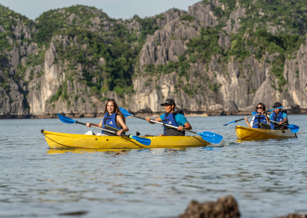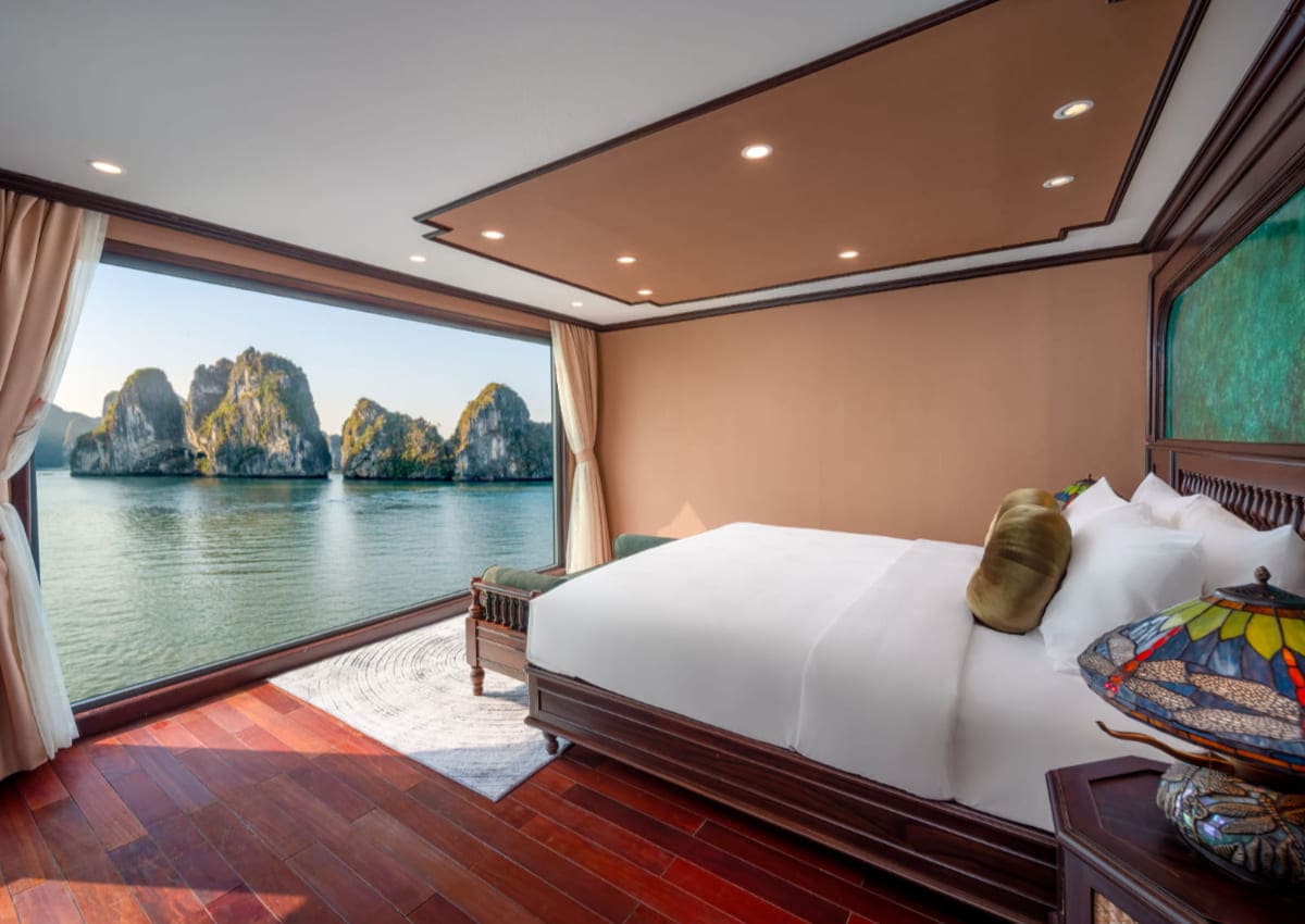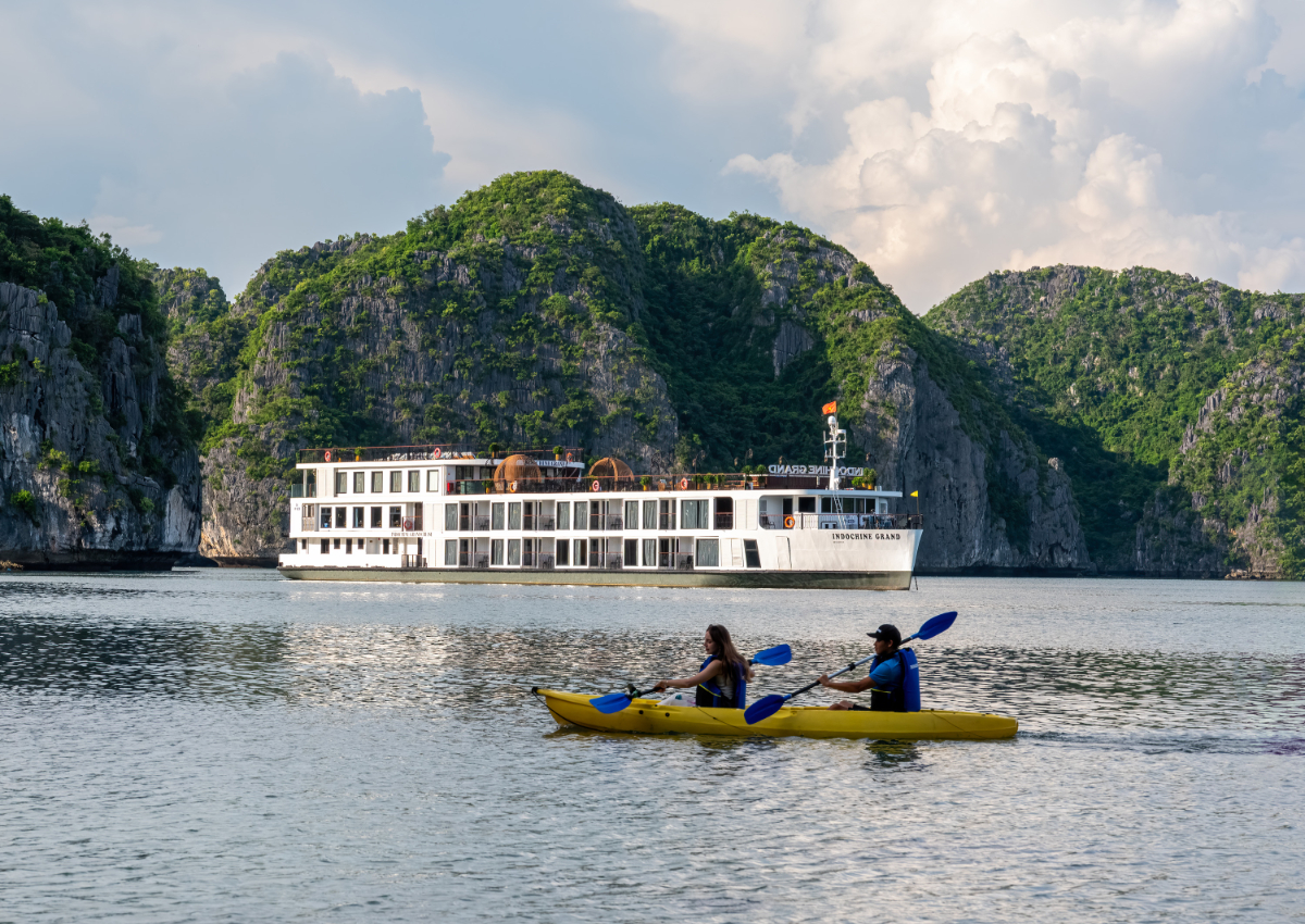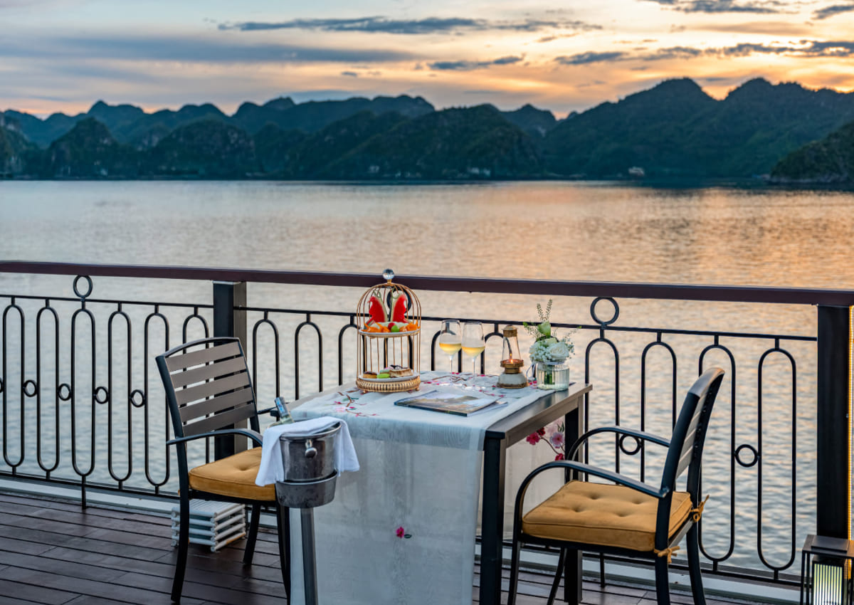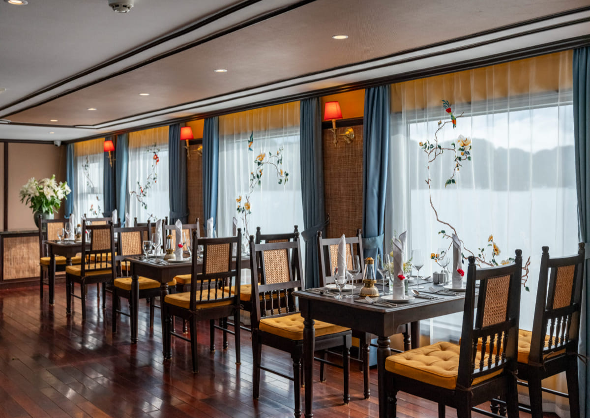在船上餐廳享用自助午餐,欣賞下龍灣壯麗的景觀,船隻輕輕穿過各個島嶼和奇特的岩石。 |